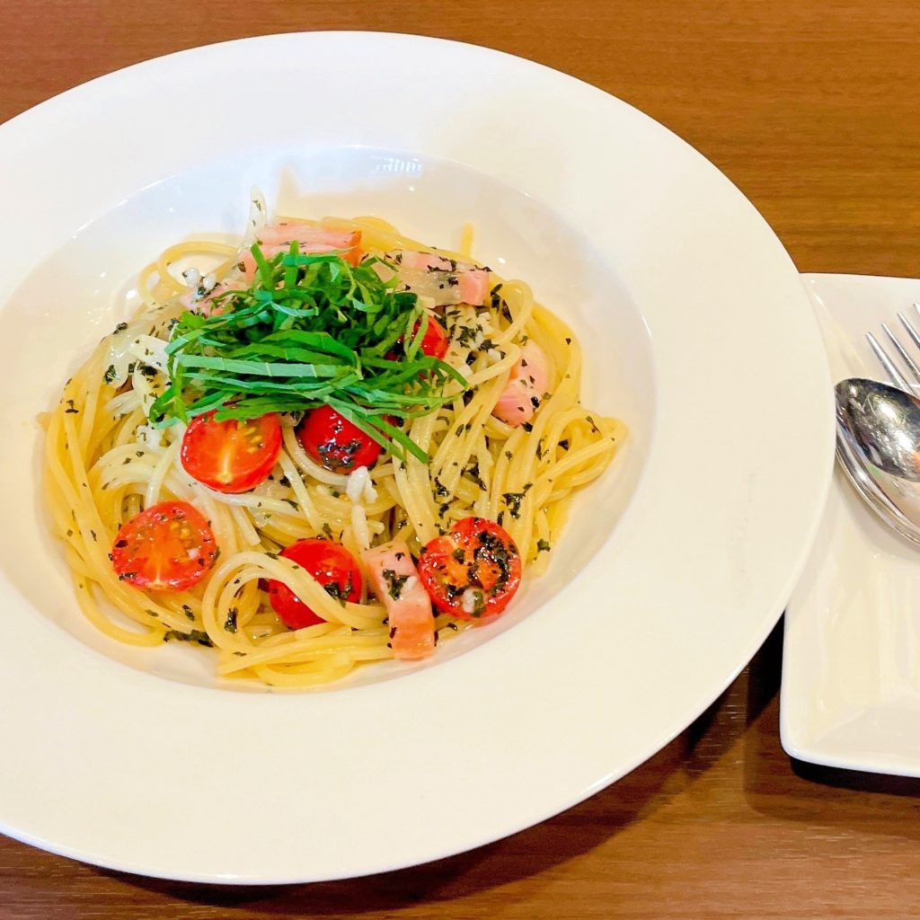 バジリコパスタにトマトと大葉が爽やか!